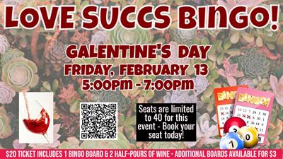 Join us for a fun-filled evening of Plant Bingo in the 1923 Legacy Lounge on Friday, February 13th 5pm- 7pm! Gather your friends, family or co-workers for your chance to win beautiful Succulents!! The ticket price of $20 includes 1 Bingo card and 2 half-pours of wine. Additional Bingo cards can be purchased for $3 each during the event on February 13th. This is an all-ages event - players under 21 or those who choose not to drink wine will receive an additional Bingo card at no charge. Players will receive a shopping coupon good for 25% off any purchases made at our retail shop or greenhouse on Friday, February 13th, 2026. Capacity is limited to 40 for this event, so book your seat today!